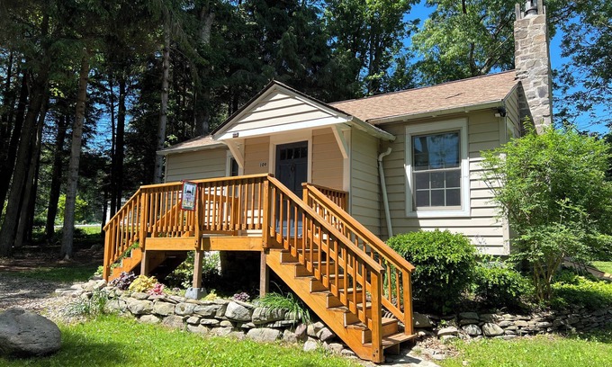 WELCOME TO BEAUTIFUL SKYVIEW COTTAGE Pocono Getaway. Enjoy relaxing in this quaint interior and private deck with beautiful hot tub operating ALL year❣climb in and relax..it’s your Pocono getaway! Fire pit, cozy main bedroom, tiled bathroom, central air, FAST Wi-Fi, fully stocked kitchen (even a blender), coffee and some spices supplied,rear deck with nice firepit, and last but not least FAST Wi-Fi with convertible workspace for those who may need to stay in touch during getaway. Longer stay discounts!