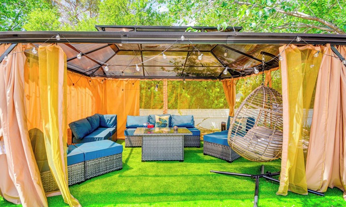 OUTDOOR LIVING: Spacious backyard, hot tub, furnished gazebo, trampoline, playground, game table, hammock, outdoor dining area, gas grill (bring your own propane), life vests