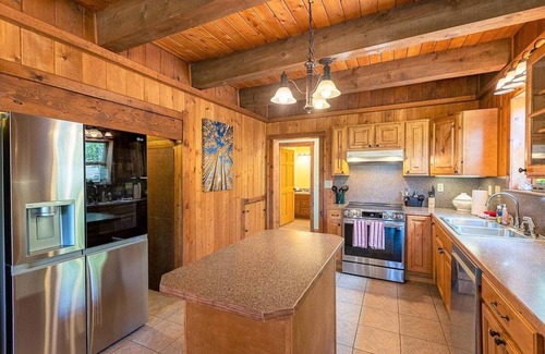 This is a simple cabin with plenty of space to hike, sled or show shoe on the property and plenty of land to play group games and explore. You enter the cabin from the large covered porch, perfect for coffee in the AM or wine in the afternoon. As you enter, on one side is the spacious kitchen that's perfect for cooking for the whole gang and plenty of kitchen items. Off the kitchen is the dining area with French Doors to the porch. Past the kitchen is a full bathroom, then a large laundry room . On the other side of the entry is the comfortable living room with plenty of space for all to hang out, gas fire place and large TV mounted on the wall. There is another full bathroom off the living room. Outside the kitchen is the gas grill.