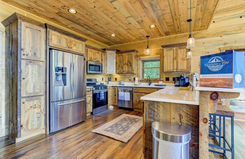 Inside, the cabin features a warm and inviting living area with a gas fireplace, perfect for relaxing with a good book or catching a show with high-speed Wi-Fi. The fully equipped kitchen makes it easy to cook up group meals, and the dining space invites everyone to chat. Outside, fire up the gas grill, kick back in the rocking chairs, and enjoy the slower pace of mountain life.