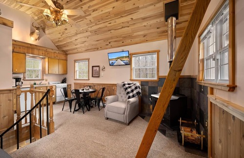 Pull up the drive to see the beautiful Tiny Oasis for your vacation. When arriving you'll notice the lovely clear stream running through the 5 acres of property you will get to enjoy during your stay. Head up the stairs to the deck where you can enjoy your morning coffee or evening sunsets looking out over the acreage. Inside you'll find the cute living room with a wood burning stove to enjoy after a long day enjoying the nature! A fully equipped kitchen including a refrigerator, stove, oven, microwave, pots and pans, dishes, a drip coffee maker with coffee and filters. Up the ladder to the loft area with a twin size bed for your extra guests. Head down the winding staircase to the master suite. Beautiful french doors to open and hear the sounds of nature or cozy up in the reading nook with a good book. Has a smart tv for your enjoyment while staying indoors.
