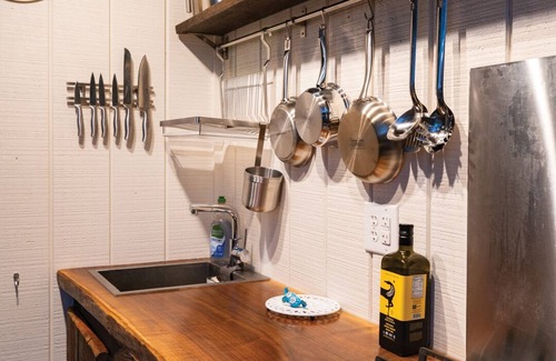 Note on modified kitchen (during winter/ early spring when freezing temps occur): The kitchen faucet will be shut off during this time but water can be obtained from the sink in the fully functional heated bathroom. During this time, disposable plates/cutlery will be provided and the grill, with provided grilling tools, can be used for cooking. A French coffee press, water kettle, and coffee/creamer/sugar will also be provided. You YOU WILL NOT HAVE ACCESS TO POTS OR PANS for the stove since there isn't a good way to wash them.