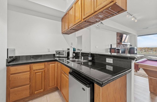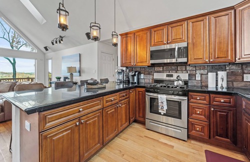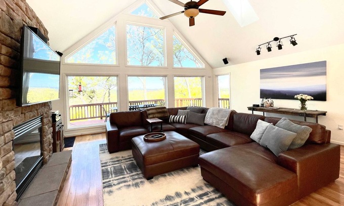 Two levels of luxury meets rustic charm, with three gas fireplaces, billiards table, hot tub (almost floating in the trees!), huge deck, and TV's with Rokus in almost every room, including bedrooms. Guests can divide into two groups, one upstairs and one down: Upstairs features the three bedroom, two bathroom space with vaulted ceilings and a wall of windows facing sunset; Downstairs features a kitchenette, two king bedrooms, bathroom and incredible views downstairs plus a separate wheelchair-friendly entrance below. There is a gas grill, gas fire pit, outdoor dining table for 10, and new carpet, paint, lighting, furniture and decor as of 2021! NOTE: there is bedding and towels for 5 king/queen beds and 4 additional twin beds that can be placed in any bedroom or living area as extra. If you intend to also use the four twin beds you must bring your own bedding for those.