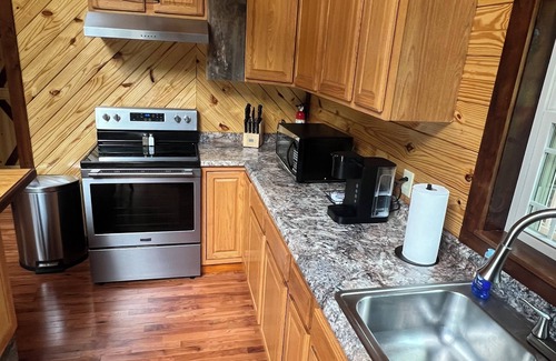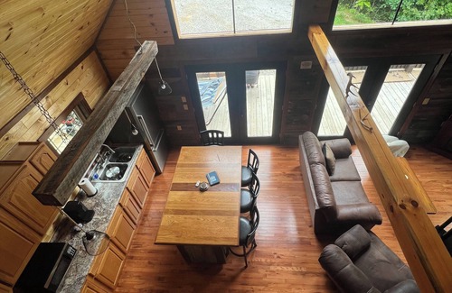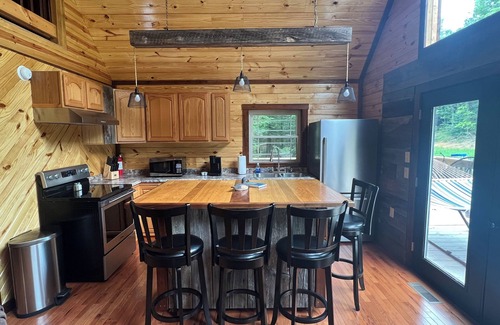 This cabin is constructed of solid wood throughout for the true cabin experience. Open concept living area with spacious loft. Living area includes a 55' flatscreen TV (WIFI) and electric fireplace. Kitchen is fully functional with all new appliances. Master bedroom with KING bed and 2 FULL beds in loft. Bathroom includes open, walk-in shower.