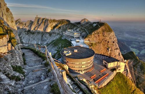 Located at the summit of Mount Pilatus at 7 feet above sea level, the Hotel Bellevue is reachable by aerial tramway or the world's steepest cog railway in summer. It features a terrace with panoramic views over the Swiss Alps and the bay of Lucerne. The restaurant serves characteristic Swiss specialties. Half-board includes breakfast and a 4-course dinner. All rooms in the Bellevue Hotel have a private bathroom with a hairdryer and offer panoramic views. The hotel can be reached by cable car from Kriens or by cogwheel train (only in summer) from Alpnachstad. Please plan your arrival in advance and be aware of the current timetable.