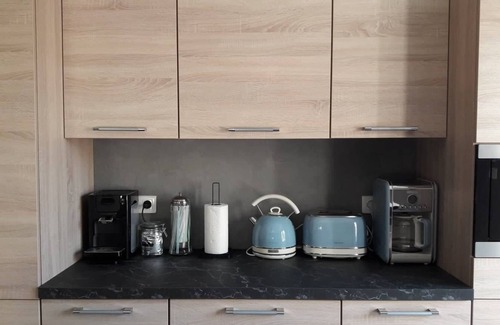 The kitchen is equipped with an oven, a stovetop, and a refrigerator, as well as a coffee maker, an electric kettle, and a microwave. Bathroom amenities include a hair dryer, towels, and toilet paper. And because there's a washer and dryer, you can go a bit lighter on your packing. Other amenities include bed sheets, an ironing board, heating, and a dining table.