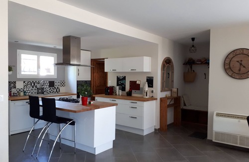 Open living room kitchen very friendly - large outdoor terrace with bench, shaded table and barbecue.
