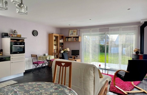Located between the village of Clohars, the beaches of Pouldu and the charming port of Doëlan, recent house on one level very pleasant. 450 m² unfenced garden. Living room, open kitchen (fridge, oven, microwave, induction hob, dishwasher), bedroom (1 double bed), shower room, WC, storeroom.