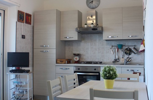 New kitchen equipped with everything you need and balcony facing the sea equipped with table, chairs and awning.