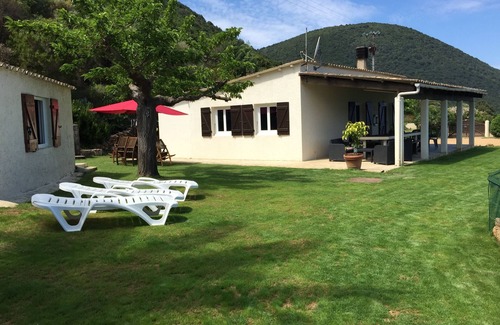 House on the seafront overlooking the Gulf of LAVA .Located 30 km from Ajaccio and 4km from the charming village of Villanova, at the end of a well maintained driveway, our house will welcome you for a quiet and peaceful holiday away from the noise from the city and other inconveniences; peace of mind is the key word for the atmosphere of this beautiful place. The house consists of 2 buildings, the main with dining room, living room, kitchen, 2 bedrooms with double bed, bathroom with toilet and a secondary which is a large room with a bed 2 places and 2 beds 1 place, a bathroom with toilet. A large terrace very well shaded will allow you to take your meals in the fridge and face the sea. If you prefer, you have a dining area where you can grill the fruit of your peach. Children can play quietly because the garden is flat and fenced