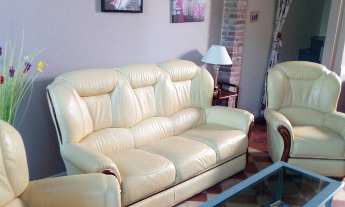 Ground floor: living room with coffee table, yellow leather sofa and armchairs, / living room with a wood stove, TV, wifi, Sony radio with CD player and MP 3 USB key player.