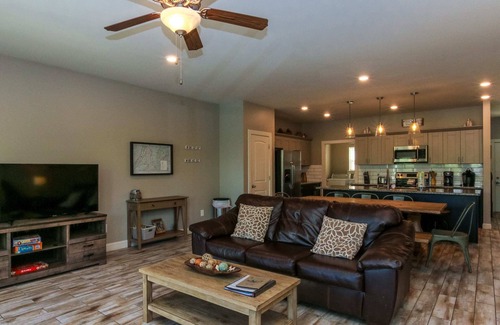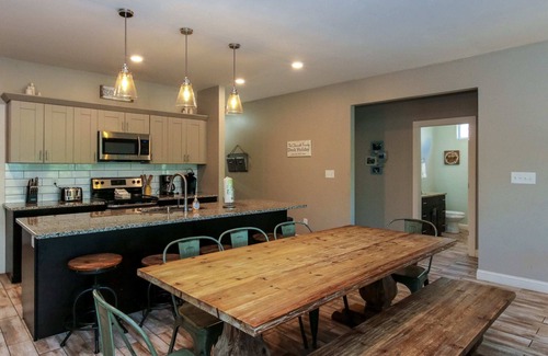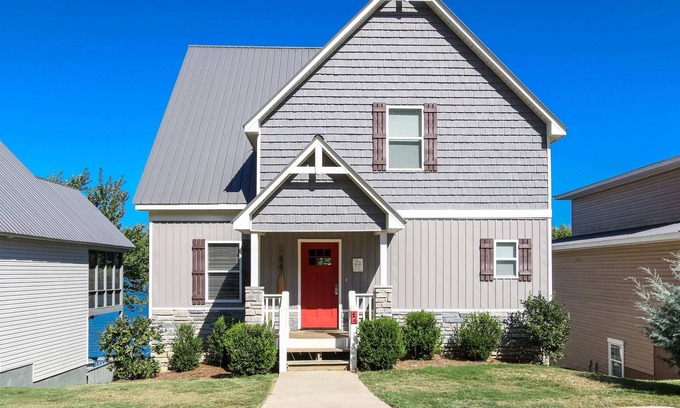 Dock Holiday is a spacious farmhouse design with direct access to the beach and lake, including a dedicated boat slip for guests. With accommodations for up to 18, it is one of the largest-capacity homes at Chesnut Bay. An enormous great room and open kitchen – the latter featuring stainless steel appliances, modern cabinets and 9-foot serving island and bar seating for 4 – enjoy fabulous direct views of the lake. A farmhouse-style dining table seats 8 Downstairs boasts another extra-large great room, and a large, covered deck seats 8 offers sublime views of the lake at sunrise and sunset. The home was designed views in mind, as four of the six bedrooms overlook the lake. The bedrooms include a second-floor master with a King bed, another bedroom with two full beds, two main-level Queen rooms, two basement Queens, basement Queen sleeper sofa and two Murphy beds. The basement-level exit opens onto a large lawn and access to the lake.