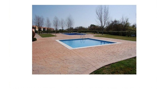The community pool is a few meters from the house. It has two swimming pools, one for children and the other for adults. The communal area has lawn and trees.