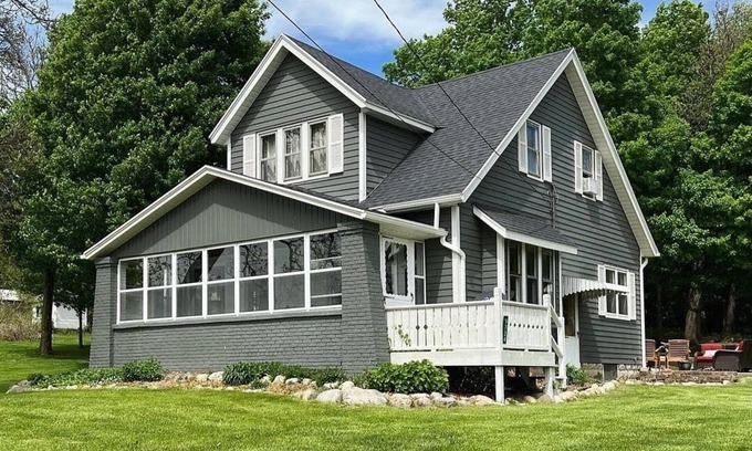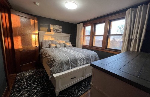 Updated turn of the century farmhouse with hardwood floors and trim throughout. Bedrooms are up a wooden staircase with landing. 1st bedroom has a queen bed, 2nd bedroom has a twin/twin trundle and full bed and 3rd bedroom has a queen bed. There is a large couch downstairs for sleeping and two air mattresses (1 twin and 1 queen) that can be set up for 8 or more guests. We charge an extra guest fee after 7 guests. Two full baths, one on the main floor and one upstairs.