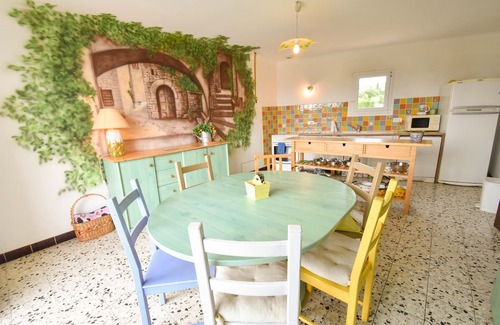 The 100 m² house is comfortably converted for 6/7 people. It offers a large swimming pool of 10 m X 5 m with a depth of 1.60 m, secured by an alarm. 3 or 4 fans available in case of heat.