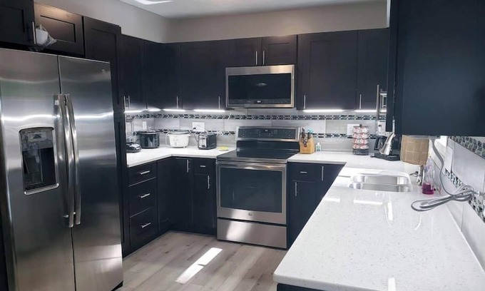 The kitchen has recently been fully remodeled and has stainless steel appliances and quartz countertops. It is fully functional with blender, drip & k-cup coffee maker, pans, skillets, baking sheets, and cooking utensils. There are also dishes, glasses, and silverware available to use during your stay.