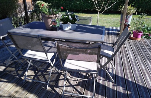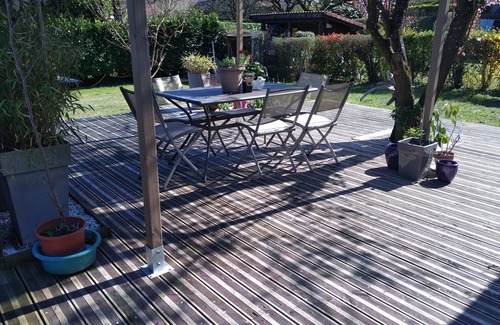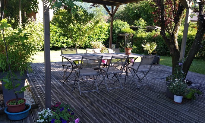 Pavilion 110 M 2 + large veranda, beautiful outdoor wooden terrace equipped with table and chairs in a garden.