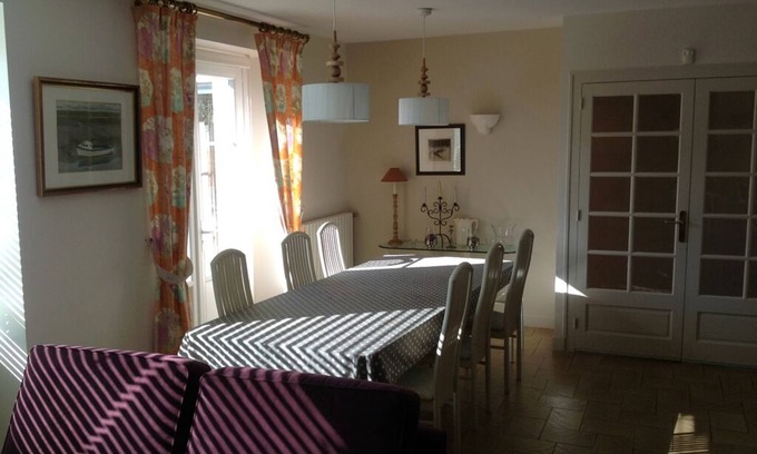 Large living room with bay window and French doors to the garden, kitchen equipped with dishwasher, lounge area, tv / dvd player and k7, hi fi channel, dining area 8 people, and large tables up to 12 people with extension