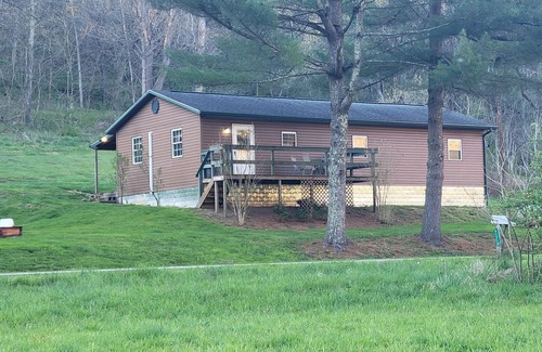 The house is set above the road with a creek acrossed the field. You can sit on the deck and the views are amazing or sit in the living room in front of the electric fireplace and read a book. You are at least a mile from a state road so you can go for a walk along the creek and not have to worry about much traffic. In the evening relax by the outside fireplace with a crackling fire. At&t has service at the house but no Verizon service, and no wifi. The house has well water with sulfer in it. It has a smell but is fine. Water Well is treated weekly with chlorine tablets so watch washing black clothes. Direct TV in living room, master bedroom TV has Nintendo hooked up. We live 10 minutes away so if you need anything during your stay we can help.