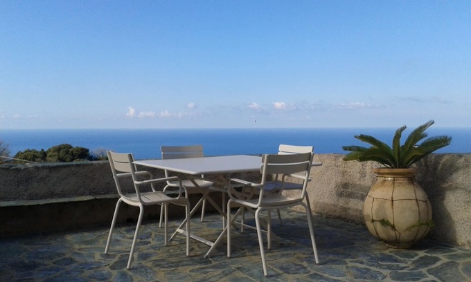 Our old stone house with a lauze roof of 130m2 is in the center of the listed hamlet of Vignale, in Canari (located between Nonza and Centuri), in a breathtaking natural site located 300 meters above sea level. It offers three magnificent terraces (20, 12, 8 m2) with 180 ° panoramic views of the sea and the daily spectacle of the sunset in front of you. The interior has just been completely refurbished in a sleek contemporary style while retaining the old charm of the house (polished concrete on the ground floor, old oiled floors on the first floor). Fully equipped kitchen (dishes, freezer + washing machine). A large living room and a small summer living room. Two very large bedrooms with sea view, plus 1 small bedroom. 1 marble bathroom with bath and shower, 1 bathroom with polished concrete shower. Vintage furniture (1930s and 1950s) and contemporary designer furniture; Fermob garden furniture. Near the house, large terraced land with old dry stone walls and magnificent umbrella pine.