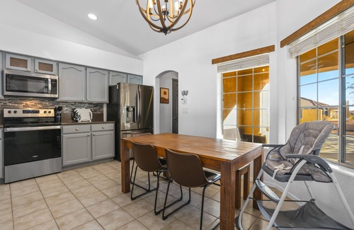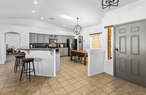The "Sunset Saguaro" sits just a few miles from either the Laughlin casinos or Katherine's Landing at Lake Mohave. You'll enter through the front patio and come through either the front door to the main house or the casita, both through a smart lock. The casita has a welcoming King bed, kitchenette, full bath and large closet-- the perfect place for a small family or grandparents tagging along. The main house was thoughtfully designed from floor to ceiling. The wall murals give a desert-sunset vibe with pops of orange and blue throughout the main living room. The split layout has the master bedroom with slider to backyard and large bathroom on one side of the house, with the other two bedrooms and bath on the other side with the open concept living room and kitchen in the center of the home.