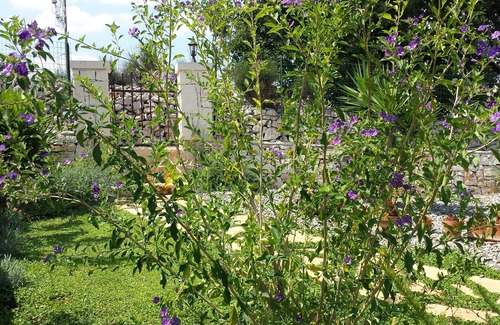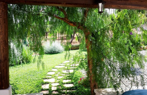 umbrellas, a lawned garden, cobblestone gardens, flower beds with succulent plants, Mediterranean bushes, fruit trees and, above all, olive trees. There is access for bicycles if needed. Availability for kids of a small play house and a small play table with chairs.