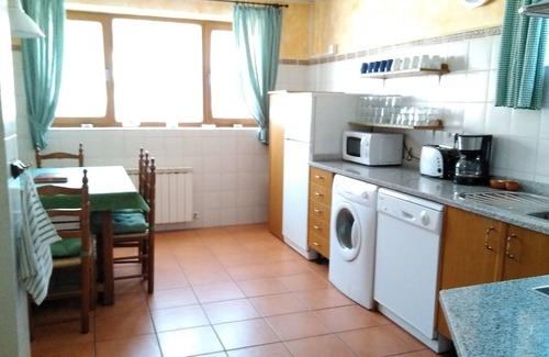 Large kitchen, with all kinds of appliances: fridge, dishwasher, washing machine, microwave, toaster, coffee maker, cutlery, dishes, glassware, etc.