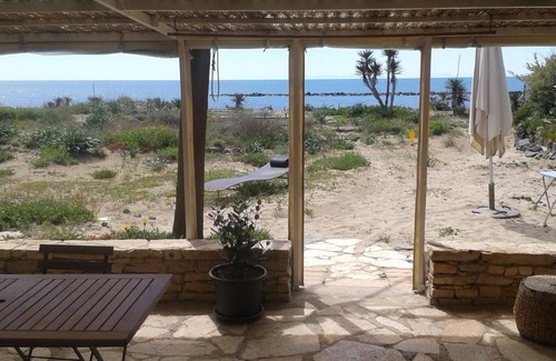 Accommodation of fifty square meters by the sea, for 4 people maximum, with two bedrooms and two double beds, living room with large corner sofa, covered terrace, garden, all on a large plot of 1000m2 facing the sea shared with another house of the same size.