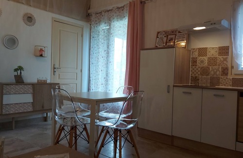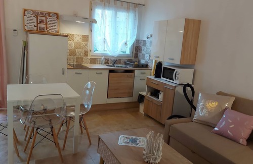 the accommodation consists of a bedroom with a double bed + a sofa bed in the living room. a bathroom with bathtub, an equipped kitchen (hob, fridge, small oven, microwave, coffee makers, kettle, toaster. TV, WIFI. Bed linen and towels are provided. travel cot and high chair available if needed. Private terrace with table and chairs, garden furniture, barbecue and clothes line.