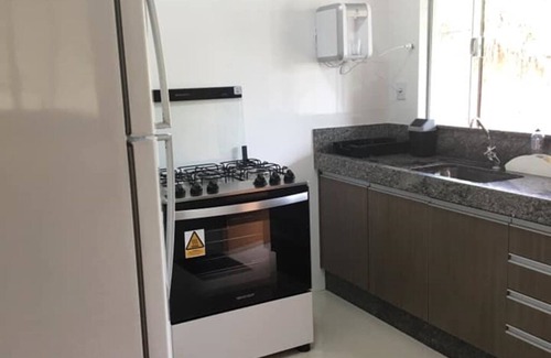 Large living room with flat TV and kitchen equipped with large refrigerator, microwave, 3 temperature water filter and 5 burner stove. It has all the domestic utensils, being necessary to take only bed linen and bath.