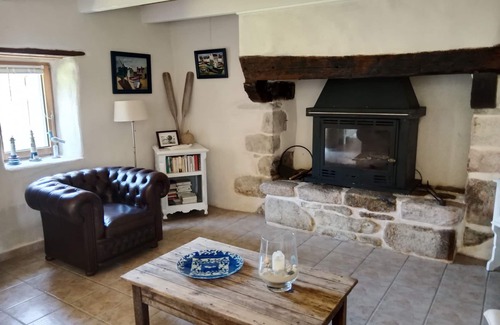 Typical Breton house, stone, independent, about 100 m2, for 4 people, bright and welcoming, decoration "seafront" living room, living room with large fireplace equipped with a wood stove, open kitchen, 2 bedrooms ( one with a double bed, the second with 2 single beds), mezzanine with 1 bed, 1 bathroom and wc on the ground floor and washbasin wc on the floor.