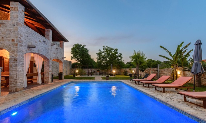 Holiday house Rose is a beautiful traditional stone house located in a quiet village near the medieval town of Svetvinčenat and can accommodate up to 10 people.There are five bedrooms, three bathrooms, a living room, and a fully equipped kitchen with a dining area.The outdoor area includes a fully fenced garden with a swimming pool, where you can relax and enjoy the Istrian sun. An outdoor dining area with a charcoal grill is available on the terrace where you can prepare delicious meals or simply enjoy a glass of good Istrian wine. For even more fun, there are table football and darts available in the villa.The surroundings of Svetvinčenat, the pearl of tourism and culture of Istria, dominated by the medieval castle of Morosini-Grimani, offer additional motifs and opportunities to explore history in a fun way, and tailored to the whole family!Holiday house Rose is surrounded by beautiful unspoiled nature and offers perfect peace and privacy. The Villa is also a good starting point for an active holiday, as almost all Istrian beaches are just a 20 minute drive. Distances: gas station 10100m, restaurant 4300m, shop 2500m, center 2500m, sea 13200m, beach 13200m, airport 24900m.