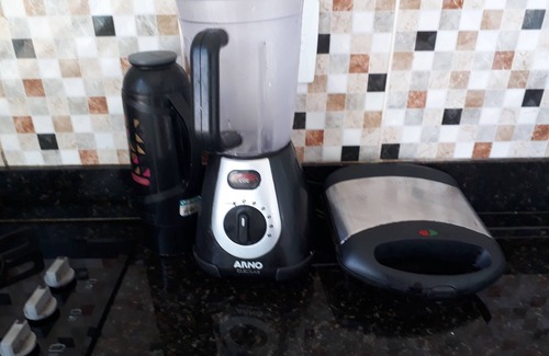 KITCHEN with fridge, stove, table, sandwich maker, blender,