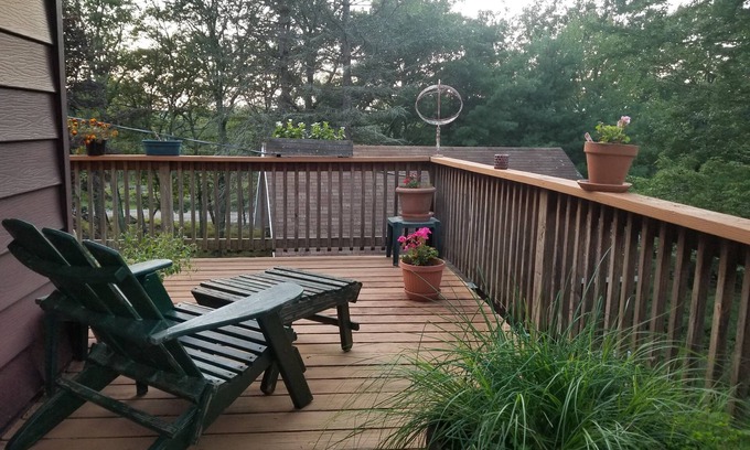 Grill/sit under the stars among the trees on the wrap-around deck. King bed in MBR, Queen in other BR, double futon in finished basement (with full laundry), pull-out in LR, plus other couches in a sunroom and an entry room.]