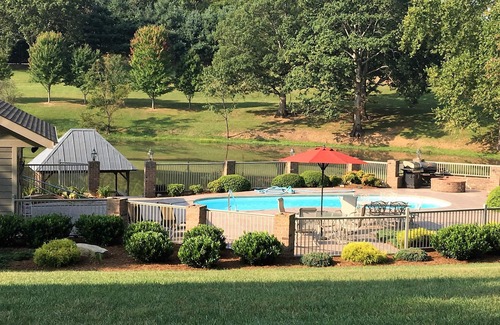 Just 25 minutes west of Asheville and 15 minutes from Waynesville and Maggie Valley with easy year-round accessibility. The 1800 square foot house sleeps 8 with 3 bedrooms (1 King and 2 Queens) and 3 large bathrooms and includes a queen sofa bed in the living area.(2 night minimum) Everything is provided for a relaxing and comfortable stay. Features include an open concept with a large modern kitchen, dining and living area. The house is handicapped accessible and a few of the amenities include Wi-Fi, cable, 4 tv's, heating and air and a full size washer and dryer. The house sits on 16 park-like acres of beautifully landscaped property, and a 2.5 acre natural pond full of fish sits in the middle of the property - bring your pole and bait! A private in-ground pool is included from Memorial Day - Labor Day, weather permitting. There is also a built-in fire pit (wood and smores skewers included!) in the pool area.