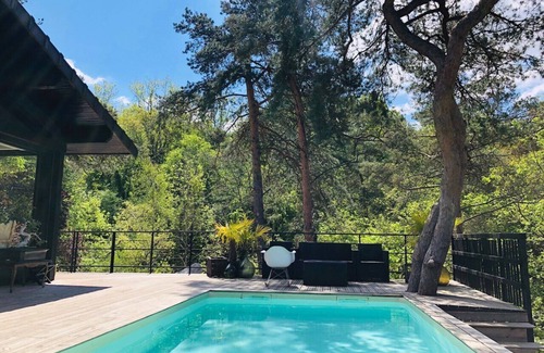 House in the forest inspired by the architect Frank Lloyd Wright, located in a dominant position in a remarkable environment of pines and oaks, and blocks of sandstone, some of which contain prehistoric engravings.
