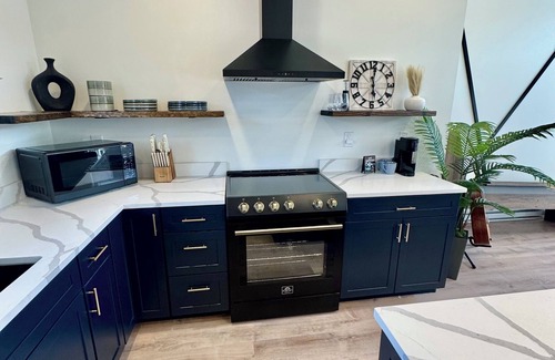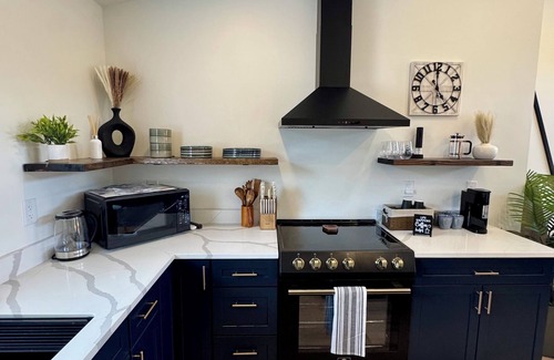 • The kitchen is fully equipped with new appliances, cookware, dishes, utensils, and a coffee maker.