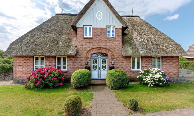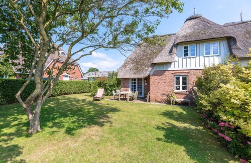 Haus Kliffkante, house half 2Guatingwai 4 a, GotingHoliday on Föhr under thatch. The house Kliffkante was completely renovated in winter 2017 / spring 2018 and offers with its bright and modern interior the perfect environment for your vacation, with a fireplace and sauna with relaxation room, the Kliffkante 2 invites you to a nice second home even in the cold travel season. There are board games and children's books for the children. A large garden and a terrace with seating invite you to take in fresh air. The beach can be reached in about 10 minutes and in the neighboring village of Nieblum you will find shops, cafes and restaurants. The accommodation is distributed over the basement, ground floor and 1st floor. Additional occupancy info: The minimum age for this accommodation is 3 years. Room layout: 1 bedroom (2 single beds), 1 bedroom (1 double bed), 1 living room, 1 hall, 1 separate kitchen, 3 bathrooms with shower. Features: Award: Pets not allowed, Child-friendly, Non-smokers. Outside: parking space f. Bikes, garden, garden furniture, parking, terrace, patio furniture. Children: high chair, toddler bed. Comfort: Cozy underfloor heating, fireplace. Kitchen / household: oven, ironing board and iron, filter coffee machine, freezer, dishwasher, microwave, tumble dryer, washing machine. Sanitary: hairdryer, towel radiator, make-up mirror. Service: bed linen / towels (additional costs) .Entertainment / communication: Bluetooth speaker, flat screen TV, additional flat screen TV, radio, satellite TV, WiFi connection for internet access, WiFi access. Wellness / fitness: sauna.