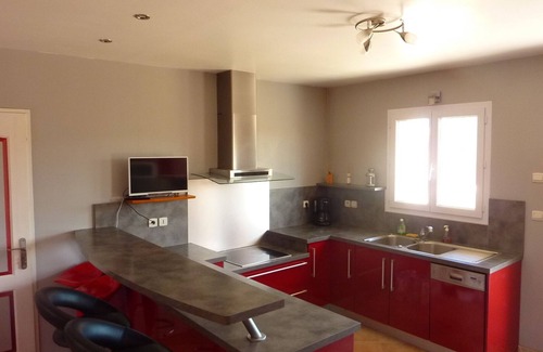 Inside, an entrance with dressing, kitchen (induction cooking, oven, microwave, dishwasher, freezer, fridge, coffee maker, toaster) of 15 m2 open to the dining room with a table and chairs a lounge with a home theater flat screen TV (Canal + CanalSat +), wifi, air conditioning and a traditional fireplace and a corner sofa.