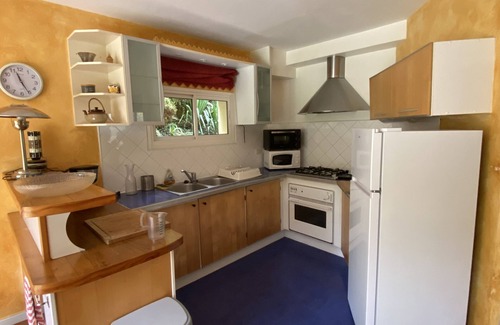 - A large fully fitted kitchen; 4-burner gas hob, oven, extractor hood, toaster, large fridge, table (extendable), chairs, cutlery for 8 people, etc. A large sliding picture window allows direct access from the kitchen into a large sunny garden, with table, garden chairs and parasol for dining outside.