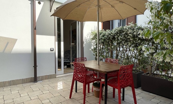 The entrance opens onto a small courtyard furnished with a large table and chairs, where guests can enjoy.