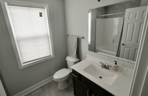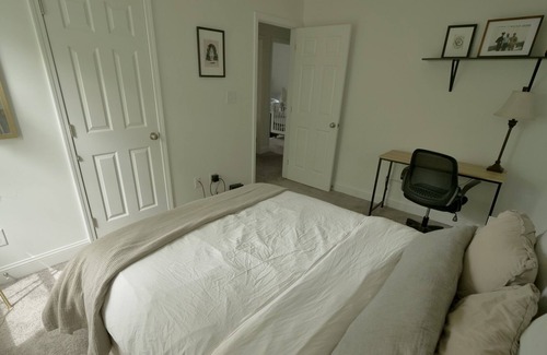 A whole house with 2 bedrooms and 2 dedicated bathrooms to each. Each room is furnished with a queen-sized bed, nightstands, lamps, a built-in closet, and a portable clothes hanger. Each room has its own "dedicated bathroom" next to it, with all basic amenities (toilet paper, hand soap, lotion, etc.) provided.