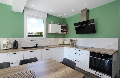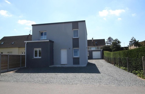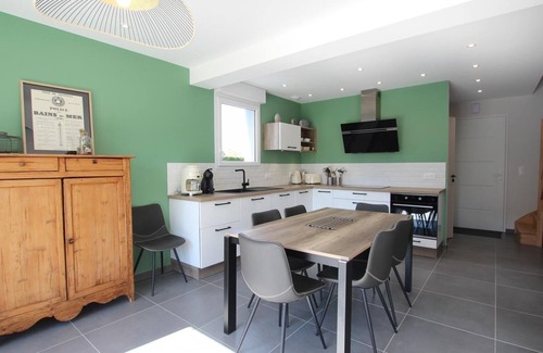 On the ground floor: large living room with a lounge (smart TV, wifi/fiber), dining area, open kitchen (steam oven, microwave, American fridge, dishwasher, induction hob...), 1 shower room with toilet, 1 double bedroom (160/200 bed, smart TV). Technical room with washer-dryer. On the 1st floor: 1 double bedroom (160/200 bed, smart TV). 2 bedrooms with twin single beds (90/200 beds convertible into a 180/200 bed, smart TV). A shower room and separate toilet. Outside: a southwest-facing terrace, a barbecue, a lawn area and a garage where 10 bikes are available (4 children's 24-inch + 6 adults), 2 paddles, beach games. 220v socket for recharging hybrid vehicles available. Baby equipment on request (travel cot, high chair, bathtub). Sheets included. Electricity and water included. Optional: towels and cleaning service are available at an additional cost. 2 pets are welcome for an additional fee. This contemporary 2021 house is located just 200m from the beach in a family-friendly seaside resort and 3km from the village of Barneville-Carteret.