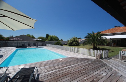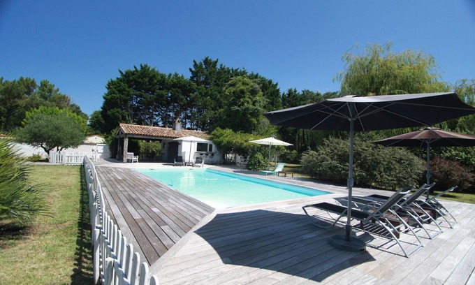 This very quiet and very bright house can accommodate up to 12 people or 3 families on a fenced plot of 6500 m2 including several covered terraces, 200 m2 of Deck around a pool unheated to dimensions of 10 x 5 m, but secure . A Pool House with an equipped kitchen allows for lunch or dinner near the pool and west side a cottage transformed into Guinguette offers exceptional sunsets near two petanque courts.