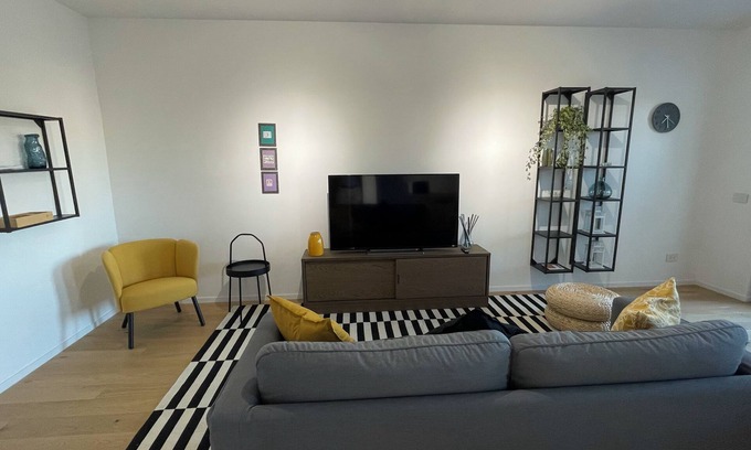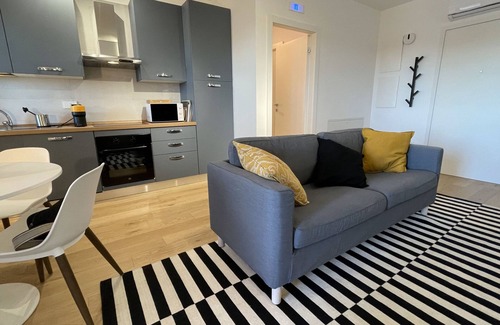 The flat's equipment is top-notch: a fully equipped kitchen (induction, dishwasher, Nespresso, kettle, toaster, microwave and traditional oven, fridge with freezer), air conditioning, 65‘’ TV, and high-quality fixtures that guarantee absolute silence.