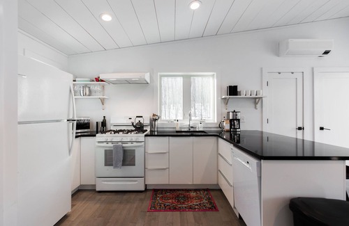 The home is a newly built modern cabin in the Catskills with all the amenities you'd need. A kitchen to cook up a storm. A living room with TV and books, two coziest of bedrooms, a huge patio and a beautiful backyard to get you into that upstate of mind.