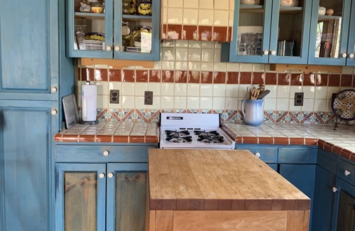 The floors are handmade Mexican Saltillo. A walk-in closet lessens clutter and there is a bank of cupboards in the half wall in which to put your things. Even the bathroom's high ceiling is tongue & groove with clerestory windows that open.