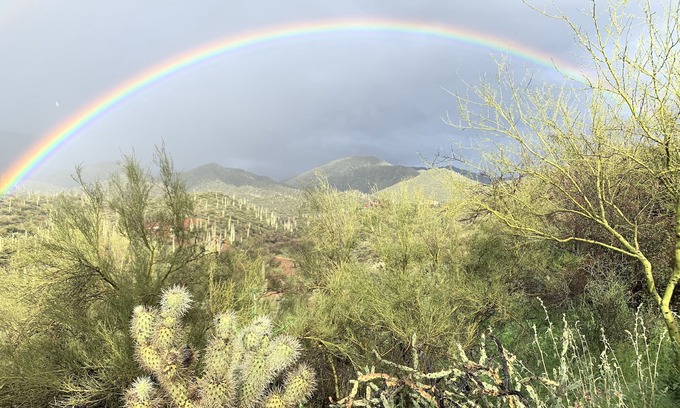 "There is no other place like it," guests write. The casita is four and one-half miles North of Cave Creek Center, sheltered, private, endless long views in which to submerge and let go of your busy self. Hear the sounds of wildlife whilst in the screened-in porch or resting on your private stone patio; let go to the sing/song of quail, dove, finch, cactus wrens, cardinals and hooting owls at night. See stars and breathe the pungent herby smells of the high Sonoran Desert.