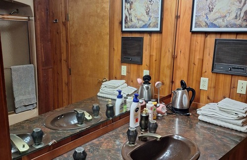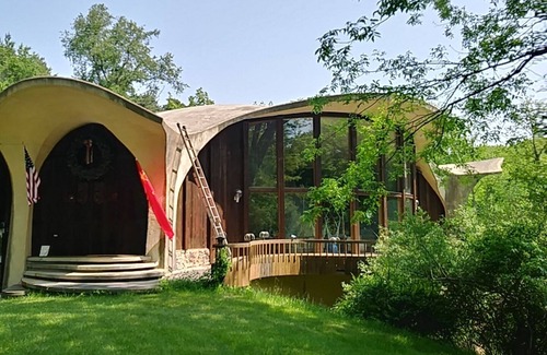 You'll travel a 1/4mi driveway, surrounded by woods, deer, turkey and a myriad of small wildlife to arrive at our 10,000sq.ft. concrete 4-domed mansion and your 2500 sq.ft. 2-domed portion with two HUGE 600sq.ft. bedrooms each with private bathrooms, and available Living Room (with sofa bed) and Kitchen. The Living Room is free for your use for up to ten guests-- four each in the two upstairs bedrooms, and two additional on the sofa bed.