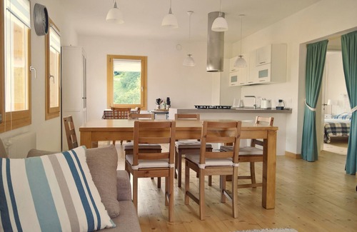 The apartment consists of a large and bright living area with direct access from the east terrace near the parking lot or from the main entrance on the north side. The kitchen is equipped with a fridge, freezer, dishwasher, five-burner stove, oven and all the necessary kitchenware. In addition there is a small breakfast table. In the dining room there is a large dining table for six / eight people, a comfortable corner sofa with a peninsula and a sideboard with a 32 inch TV. There are two double bedrooms, a larger one facing the valley and a smaller one, overlooking the forest. There is then another bedroom where various useful things are stored at home: drying rack, iron and ironing board, electric broom, mop, etc.